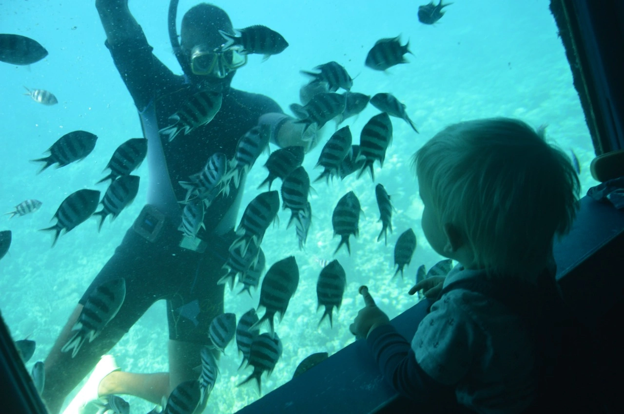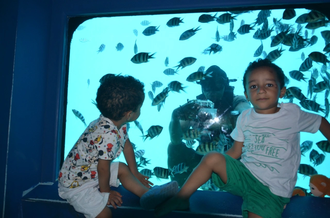 Нижняя палуба яхты опущена под воду на 4 метра и имеет панорамные окна, через которые можно наблюдать за подводным миром Красного моря. Понаблюдаете шоу аквалангиста, который будет подкармливать жителей глубин, чтобы вы увидели как можно больше разнообразных рыбок.